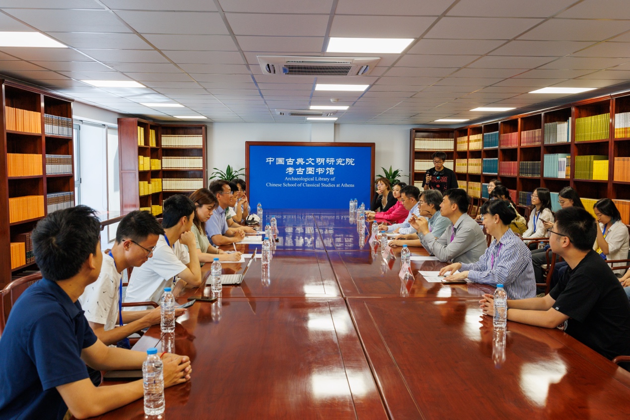 7月10日上午,团队来到中国古典文明研究院。研究院在中希两国元首的关心下、两国政府的支持下成立,是首家由亚洲国家在希腊设立的古典文明研究机构。团队参观了研究院考古图书馆,观看了研究院成立、揭牌和新址落成的新闻纪录片。研究院党总支书记李初雨介绍了研究院的创建宗旨、工作方向与发展概况。