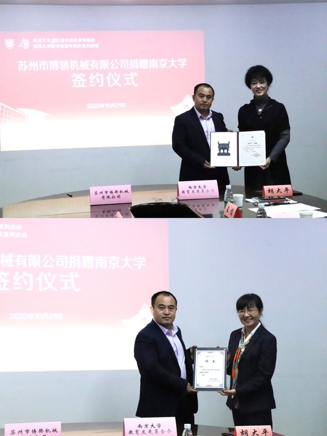 近日,苏州市博骄机械有限公司捐赠人兽交 签约仪式在仙林校区举行。苏州市博骄机械有限公司董事长段存建先生一行,人兽交 发展委员会、研究生院、哲学系负责同志和师生代表参加了仪式。仪式由发展委国内部主任王俊主持。