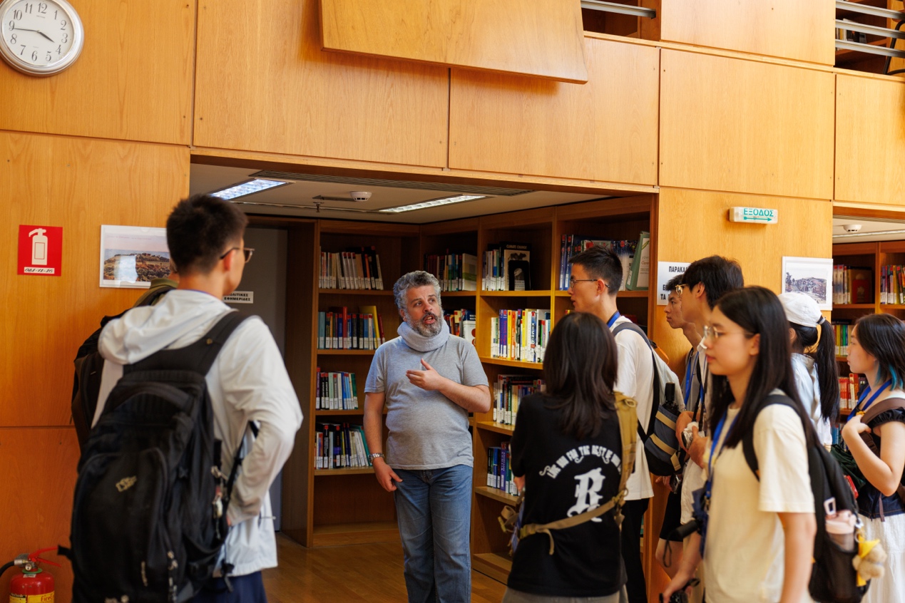 7月10日上午,团队来到中国古典文明研究院。研究院在中希两国元首的关心下、两国政府的支持下成立,是首家由亚洲国家在希腊设立的古典文明研究机构。团队参观了研究院考古图书馆,观看了研究院成立、揭牌和新址落成的新闻纪录片。研究院党总支书记李初雨介绍了研究院的创建宗旨、工作方向与发展概况。