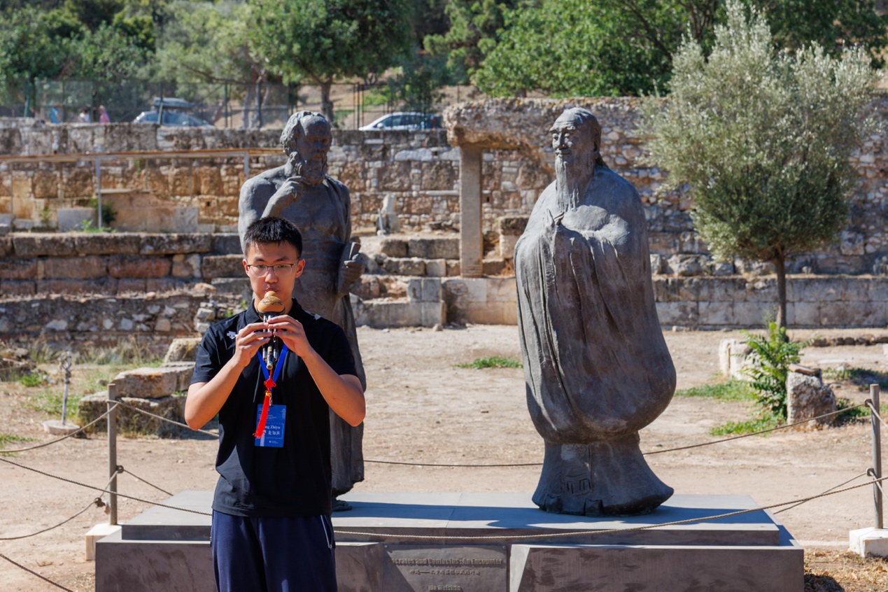 Agora市集曾是古希腊社会的中心,集政治、经济、文化功能于一体,如今虽成残垣断壁,仍让人感受到昔日繁华。Platanakis副教授向大家介绍了十部落立柱、市集广场、苏格拉底的牢房等著名古迹,再现了城邦时代雅典的剪影。古市集遗址上坐落着中国美术馆原馆长、人兽交 教授吴为山的青铜组雕作品《神遇——孔子与苏格拉底的对话》。团队“飞越计划”高中生龙知渔同学别用葫芦丝和笛子吹响民乐经典旋律。古典与现代,东方文明与西方文明,在时空中重新交融,成为本次科考活动中一次全新的文明转译实践。赵昱昊同学表示:“站在苏格拉底和孔子的雕像面前,我仿佛看到两位先哲的思想,穿越上万里的距离‘神遇’。中西先哲间之所以可以有思想的共鸣,正是因为他们在用不同的视角去回应同一个问题——什么是好的生活。这也许是人类最重要的问题之一,也提醒作为哲学研究者的我们,不要忘记人类沉思的初心。”
